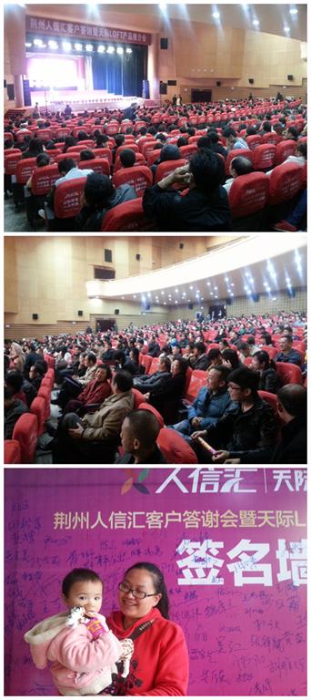 11月10日, 荆州人信汇客户答谢会暨天际loft产品推介会在荆州凯乐大剧院隆重举行,初冬早上的微寒与近1000位客户的参会热情形成了鲜明的对比。10点整,活动准时开始,经过国内知名经济学教授及规划部门相关领导的深入讲解,到场客户对北京中路及LOFT产品的投资价值有了更深刻的理解,并表示出极大兴趣,当天更有众多客户现场认筹。随着万元金条大奖及MINI PAD等时尚奖品的不断抽出,现场气氛更是被推向了一个又一个高潮。