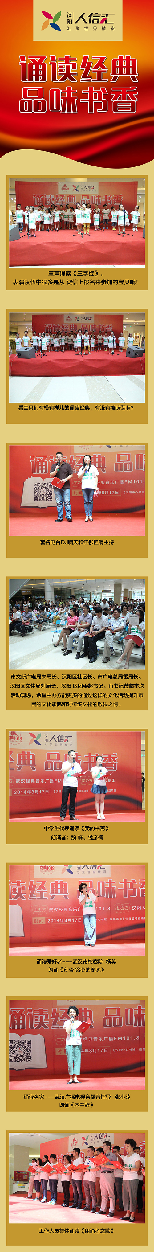 主办方特邀国学大家、知名主持人,一起带领孩子领略诵读国学经典的美妙。诵读经典有童声诵读《三字经》、中学生代表、家长代表、武汉电视台、武汉广播电视台播音名家、武汉经典音乐广播主持人、汉阳人信汇员工等各方代表诵读经典名篇。活动现场有电台音频、电视台视频同步直播。