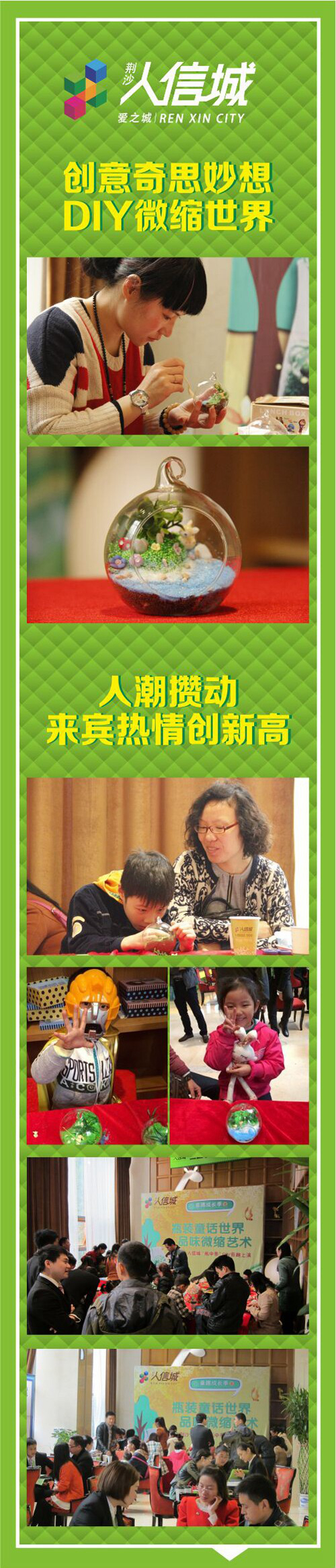 9:00,抢先扫描二维码的来宾,领取了活动体验券和精美的城城笔记。认真观看专业微景观艺术师讲解、演示“瓶中景”DIY,来宾们发出阵阵惊叹和欢呼,并纷纷跃跃欲试。看着儿子DIY瓶中景的认真模样,马先生告诉工作人员:”人信的活动挺不错,儿子总吵着要来。我们很满意这里的房子,今天成功选到中意的,参与砸金蛋还送了家电,非常高兴!“