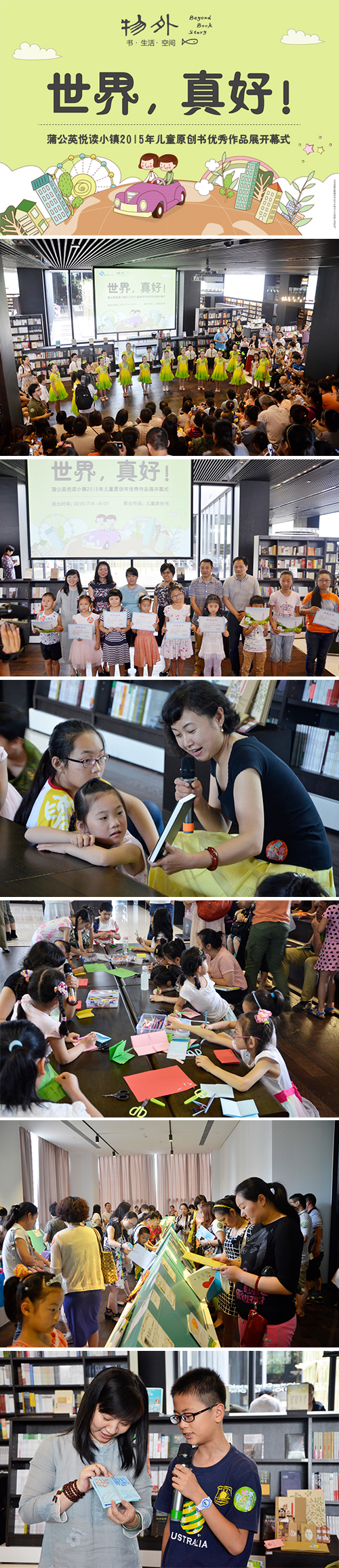 2015年7月4日,由人信•物外书店和蒲公英悦读小镇联合举办的”世界,真好!“蒲公英悦读小镇2015年儿童原创书优秀作品展开幕开幕式如期举行。武昌区人民政府副区长向悦、武汉市委宣传部副部长朱向梅、武汉市委宣传部宣教处殷处长、儿童文学作家新月姐姐应邀出席。
