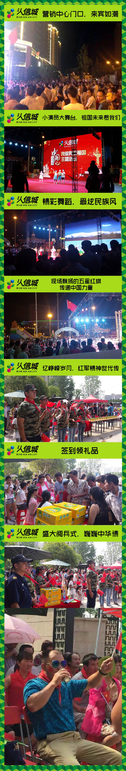 人信地产跟随党和政府的脚步,积极将文化建设、教育启蒙作为企业发展的社会责任,“牢记历史、珍爱和平、勿忘国耻、圆梦中华。”70年前那场决定世界前途命运的伟大胜利,永远铭记在所有爱好和平与正义的人民心中。黄陂人信城做为人信地产住宅系列首发项目,一直致力打造黄陂人民的好房子!响应政府号召,致力打造美好未来生活!在这重大的日子里,黄陂人信城举行了大型爱国主义教育主题活动:9月2日爱国主义主题晚会; 9月3日祖国盛大阅兵式现场直播观礼仪式。
