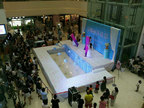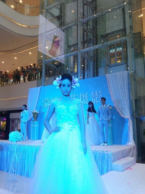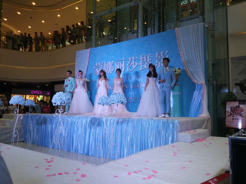 联合蒙娜丽莎婚纱摄影机构在负一楼中庭举办了一场典雅的婚纱秀,给大家带来一场视觉盛宴。靓丽的模特、华丽的婚纱礼服以及绚丽多彩的文艺演出吸引了众多观众的目光。