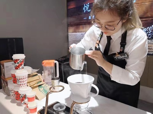 研磨、烹煮、过滤,特调师用虹吸咖啡壶细心地为嘉宾展示咖啡的制作方法,提示制作时需要注意的点。一顿操作下来,倒入杯子中的咖啡,滴滴香浓。随后,特调师拿出牛奶倒入咖啡,手腕摆动,优美的花纹显现,一杯拉花咖啡不一会儿便制作完成,嘉宾们热情的为之送上掌声。