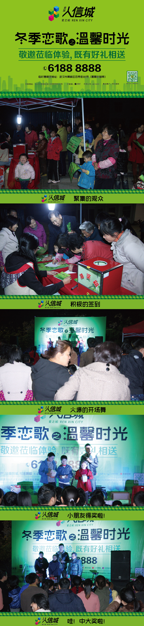 2013年11月16日晚,黄陂人信城“冬季恋歌”路演活动走进黄陂区六指街道,在已渐渐寒冷的冬季里面为当地居民带去人信城的温暖,让他们感受到人信城以爱筑城,代言黄陂爱的表达。