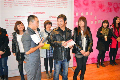 “约会”结束后,活动迎来第二个环节——趣味游戏。此环节以配对男女嘉宾为主要参赛成员,没有配对成功的现场找搭挡。现场组队完毕之后进入互动PK的游戏环节。“郎比妾猜”、“你哼我猜”等,每一轮游戏胜出者都将得主办方提供的电影套票一份。在玩游戏的同时,通过猜词语、猜歌名等男女嘉宾们又进一步加深了彼此的印象、测试了彼此的契合度,给大家提供了一个氛围更加自然、欢快的相亲平台。