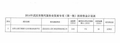 喜讯!历经长达一年的紧张筹备和评选,我司“人信汇购物中心O2O移动电商平台”项目,喜获武汉市2014年现代服务业专项扶持资金。这同时也是武汉市今年首批获得扶持的重点项目。该扶持资金的申报成功,意味着我司O2O移动电商平台项目获得市政府的高度认可和大力支持!