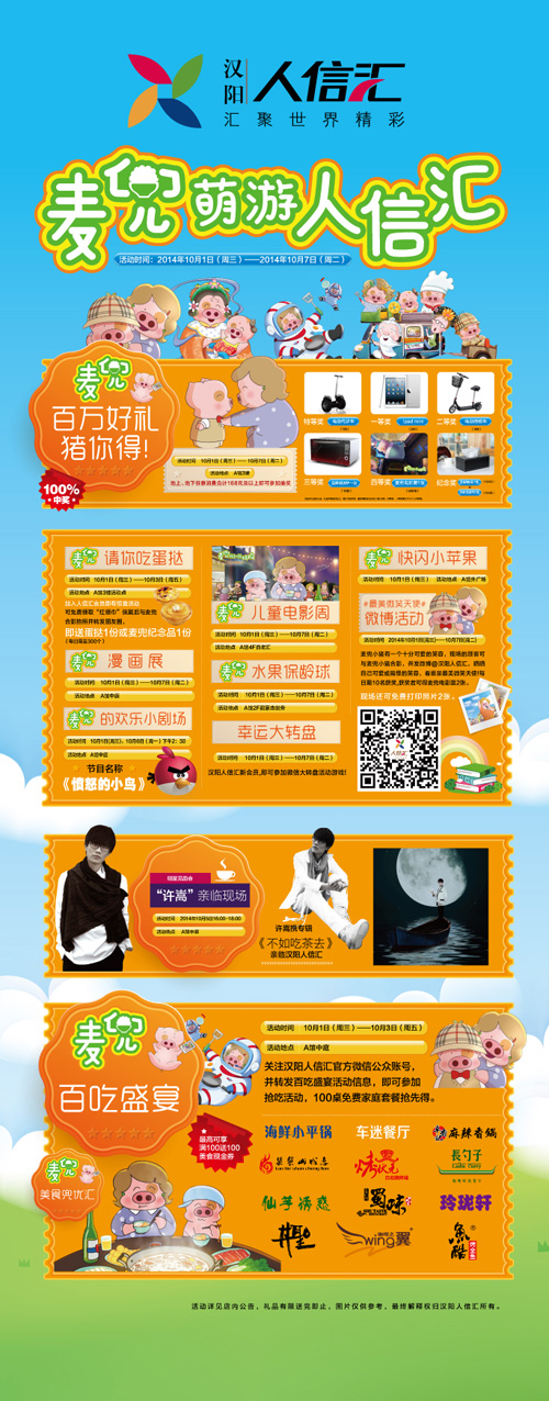 麦兜还带来了30个卡通小伙伴进行快闪舞蹈秀,除了30位卡通小伙伴,麦兜还带来了一位明星朋友。他改变了人们对网络音乐的看法,他唱作俱佳才华横溢,他是新一代创作型音乐人,他就是许嵩!10月5日,他将带着他的全新专辑《不如吃茶去》来到汉阳人信汇,与粉丝互动。