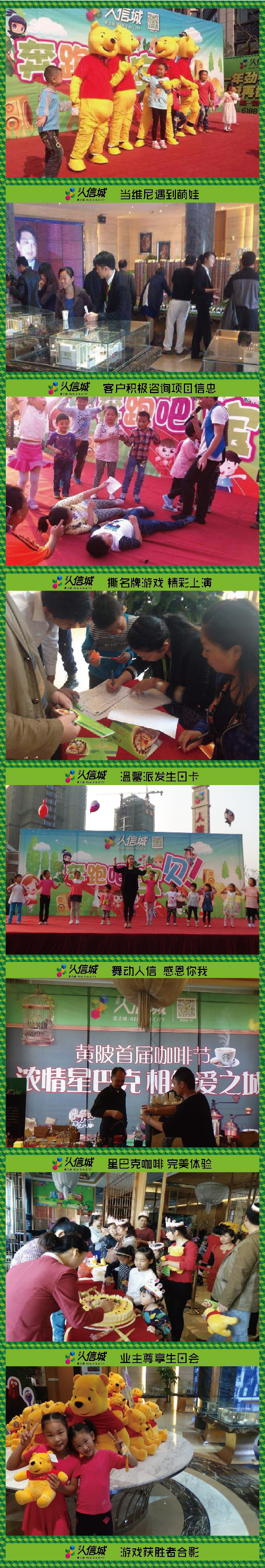 本次黄陂首届咖啡品鉴节活动的现场,黄陂人信城还为天秤座的业主们举办了生日宴会,现场精心准备的祝福贺卡、生日礼物及生日蛋糕,在为寿星们点上蜡烛后,现场的工作人员扮演维尼齐唱生日快乐歌!想必任何人,都会被这个生日Pary所感动吧!祝福过后,业主们还有醇美、香浓的咖啡之享,畅然、悠闲的时光珍藏••••••外场是我们大型亲子栏目“奔跑吧,宝贝”,宝贝们各个活力四射,现场互动更是精彩纷呈。一笔一笔地雕刻着专属于上层精英的品质生活,也雕刻着黄陂人信城的人居关怀。