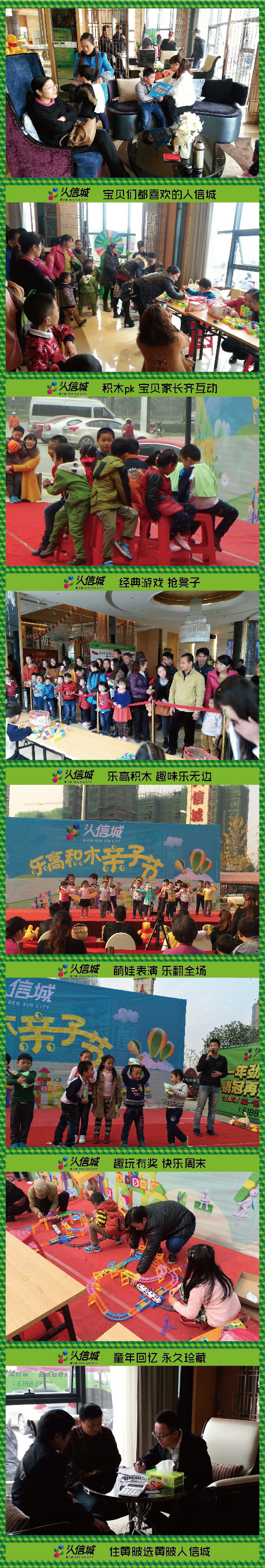 继上周末人信城成功举办黄陂首届亲子阅读节后,2014年11月22日,黄陂人信城携手世界十大玩具之一的乐高玩具,开启了本次亲子体验的乐高积木主题活动。乐高积木曾经伴随着无数孩子成长,黄陂人信城为广大业主和孩子们献上此次活动,希望让孩子们尽情释放创意与热情,同时让70后、80后家长们也能重温儿时浪漫童真的美好时光!