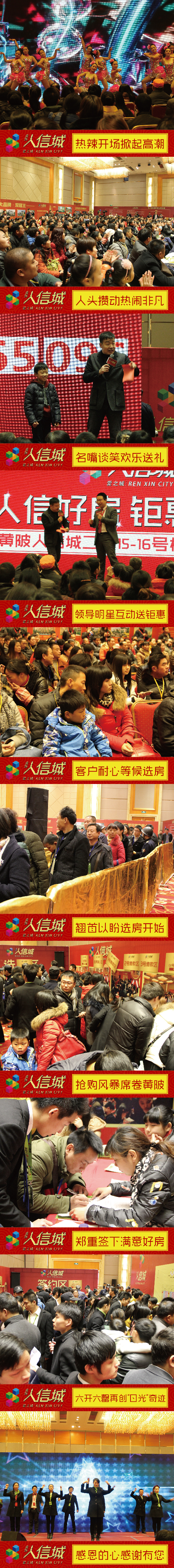 清晨7:00点,近500名购房客户齐聚纵横大酒店五楼宴会厅,刺骨寒冬难挡客户购房热情。主持人谈笑宣布黄陂人信城开盘活动于9:08准时启动,本次参加开盘的客户怀着激动不已的心情在和大明星谈笑近距离接触、频频互动的同时,更感受到人信地产作为大品牌重视客户价值的企业文化。本次开盘活动采用电子摇号方式进行选房,整个选房过程都在公平、公开的氛围下火爆的进行着,每5个一组被摇到号的客户使选房区急剧升温,场内气氛空前火爆,销控公示板上一片“飘红”——黄陂人对于项目的热爱与追捧再一次让人信城以热销代言黄陂!