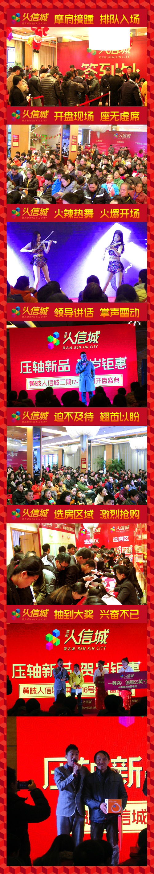 2015年12月27日,黄陂三冠王——黄陂人信城第10次耀世开盘,17、18号楼作为年度贺岁精品礼献全黄陂。开盘当天上午,人头攒动、场面十分火爆,现场推出房源被抢购一空,再创热销传奇。