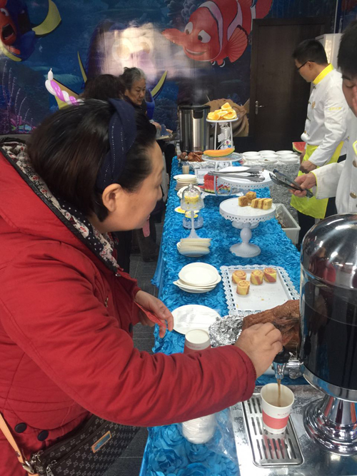 现场,最诱人的还是“美式火鸡大餐”。用多种香料腌制,肚中佐以拌好的食物,历经4到5个小时的焙烤,出炉后的一只只火鸡,色泽金黄、肉香四溢,每每呈上桌,不待大厨一一分割好,众人一哄而上,一抢而空。除了原汁原味的美式大餐体验,现场还有薯条、糕点、水果拼盘等精致自助美味倾情奉上,让每一位到场客户感受天誉冬日的温暖,也品尝到“家”的小确幸。