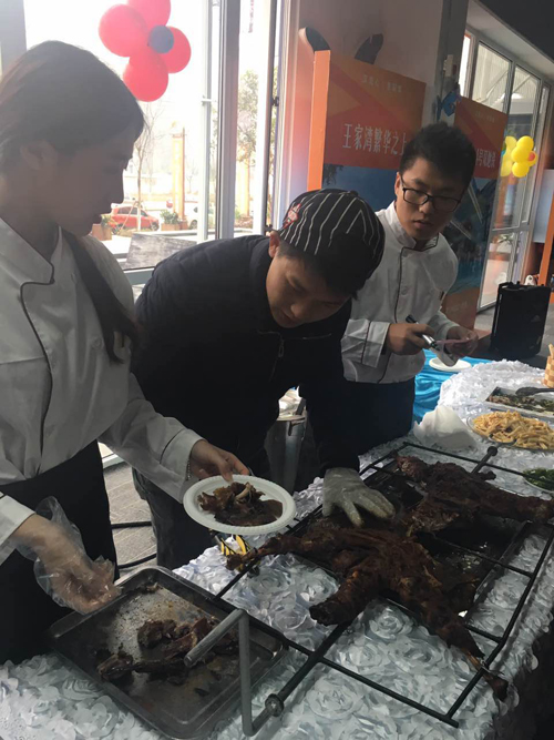 上午10:00左右,还没走到营销中心,就闻到空气中弥漫着一股鲜美的羊肉味。在营销中心的外场几位大师傅专心致志的烤着全羊,一群客户颇有兴趣的围在一旁拍照,并不时的向师傅们讨教烧烤技巧。据师傅介绍,他们精选上等好羊,清洗干净后用古法腌制,既能避免羊膻味,又能入味均匀。金红油亮的烤全羊,让一众垂涎三尺的来宾不顾羊肉烫口,大快朵颐,直呼过瘾。