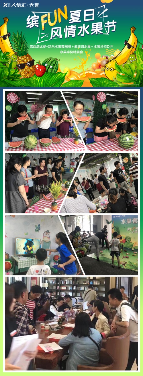 炎炎夏日,为答谢新老客户,汉阳人信汇天誉特意举办“缤FUN夏日,风情水果节”活动,凡到访客户均可在营销中心享受水果风情大餐,同时还有吃西瓜大赛、水果半价特卖会、欢乐套圈圈等精彩互动,嗨FUN全场。新老客户齐聚一堂,在天誉享受一个“清凉”有趣的周末。
